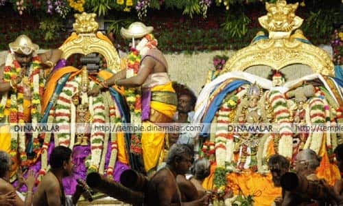 மதுரை: மதுரை மீனாட்சி அம்மன் கோயில் சித்திரை திருவிழாவின் முத்திரை பதிக்கும் முக்கிய நிகழ்வான, மீனாட்சி சொக்கர் திருக்கல்யாணம், மே 7 ல் காலை 8:35 மணிக்கு மேல் காலை 8:59 மணிக்குள்ளும், திருக்கல்யாண அறுசுவை விருந்து சேதுபதி மேல்நிலைப்பள்ளியிலும் நடக்கிறது.