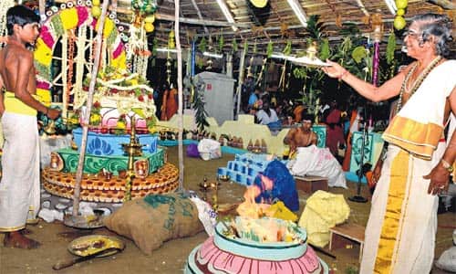 உசிலம்பட்டி: உசிலம்பட்டி தாலுகாவில் நாட்டாமங்கலம் மூன்று தேவர் வகையறாக்களுக்கு பாத்தியப்பட்ட ஆதிசிவன் கோயில், ராஜகோபுரம், ஓங்கார சோணைமுத்து விநாயகர், வடக்குவாசல் செ்ல்லிஅம்மன், பூர்ண புஷ்கலாம்பாள் சமேத அய்யனார் ஆகிய நான்கு கோயில்கள் மற்றும் பரிவார தெய்வங்களுக்கு கும்பாபிஷேகம் நாளை(மே 7) நடக்கிறது. இதை முன்னிட்டு நேற்று காலை 9:00 மணிக்கு கணபதி ஹோமத்துடன் பூஜை துவங்கியது. இரவு 7:00 மணிக்கு யாகசாலை பிரவேச பூஜைகளும் முதல் கால யாக வேள்விகளும் நடந்தன. இன்று காலை 8:00 மணிக்கு இரண்டாம் கால பூஜையும், மாலை 5:00 மணிக்கு மூன்றாம் கால பூஜைகளும் நடக்கின்றன. நாளை காலை 4:30 க்கு நான்காம் கால பூஜைகளும் காலை 7:28க்கு கும்பாபிஷேகமும் நடக்கிறது. இதைதொடர்ந்து சுவாமிகளுக்கு அபிேஷகம் நடக்கிறது. மூன்று நாட்களும் அன்னதானம் வழங்குகின்றனர். விழா ஏற்பாடுகளை திருப்பணிக்குழு தலைவர் தங்கம் குரூப்ஸ் சேர்மன் ராஜாங்கம், பெரியவாகைக்குளம், சின்னவாகைக்குளம், பெருங்காமநல்லூர், நாட்டாமங்கலம், அய்யம்பட்டி, சக்கரைப்பட்டி, நாகலாபுரம் கிராம மக்கள் இணைந்து செய்து வருகின்றனர்.
