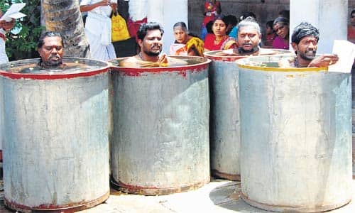அருப்புக்கோட்டை: அருப்புக்கோட்டை கோயிலில், நகரில் மழை பெய்ய வேண்டி, அண்டாவிற்குள் அமர்ந்து ஜபம் நடந்தது. அருப்புக்கோட்டையில் கடந்த நான்கு ஆண்டுகளாக மழை சரிவர பெய்யவில்லை. இதனால், நீர்நிலைகள் வறண்டு, நிலத்தடி நீர் மட்டம் குறைந்துவிட்டது. மக்கள் தண்ணீர் தேடி அலையும் நிலை ஏற்பட்டுள்ளது. வெயிலின் கொடுமை நாளுக்கு நாள் கடுமையாக உள்ள நிலையில், மழை பெய்வதற்கான அறிகுறியும் இல்லை. அருப்புக்கோட்டை மற்றும் சுற்றுபகுதியில் மழை பெய்ய வேண்டி, அருப்புக்கோட்டை சொக்கலிங்கபுரம் மீனாட்சி சொக்கநாதர் கோயிலில் நேற்று காலை, வருண ஜபம் நடந்தது. மூன்று அண்டாவில் தண்ணீர் நிரப்பி, அர்ச்சகர்கள் உட்கார்ந்த நிலையில், மழை வேண்டி பலமணி நேரம் ஜெபம் செய்தனர். பின்னர், சுவாமி அபிஷேக ஆராதனைகள் நடந்தன.