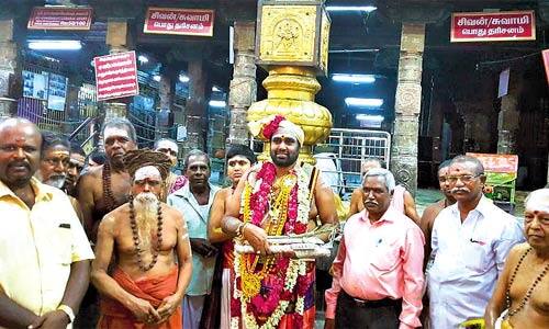 புதுச்சேரி: திருநள்ளார் சனீஸ்வர பகவான் கோவில் வைகாசி விசாக பிரம்மோற்சவ விழா கடந்த 21ம் தேதி கொடியேற்றத்துடன் துவங்கியது. முக்கிய நிகழ்வான தீர்த்தவாரி விழா, கடந்த 7ம் தேதி நடந்தது. அதைத்தொடர்ந்து, கடந்த 8ம் தேதி விழா நிறைவு நாளில் சண்டிகேஸ்வரர் மற்றும் ஆச்சார்ய உற்சவம் நடந்தது. சண்டிகேஸ்வரருக்கு சிறப்பு அபிஷேக ஆராதனை முடிந்து, நான்கு மாட வீதி உலா நடந்தது. பின்பு, ஆச்சார்ய உற்சவம் துவங்கியது. கோவில் ரட்ஷாபந்தன சிவாச்சார்யரான ராஜா சுவாமி நாதர் சிவாச்சாரியருக்கு கோவில் சார்பில் பரிவட்டம் கட்டப்பட்டது. கோவில் நிர்வாக அதிகாரி பன்னீர்செல்வம், கோவில் கட்டளை தம்பிரான் சாமிகள், சிவாச்சார்யார்கள் சால்வை அணிவித்து வாழ்த்தினர். மங்கள வாத்தியங்கள் முழங்க, ராஜா சுவாமிநாதர் சிவாச்சார்யார் அவரது இல்லத்திற்கு அழைத்து செல்லப்பட்டார். அங்கு, விக்னேஷ்வர பூஜை நடத்தப்பட்டு பிரசாதம் வழங்கப்பட்டது.