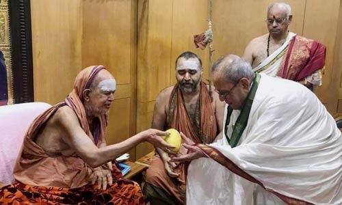 கோவில் வாசலில், இந்து சமய அறநிலையத்துறை ஆணையர் வீரசண்முகமணி, பிரணாப் முகர்ஜிக்கு பொன்னாடை அணிவித்து, வரவேற்றார். காமாட்சியம்மன் கோவில் சார்பில், பூரண கும்ப மரியாதை அளிக்கப்பட்டது. பேட்டரி காரில் ஏறி, கோவிலுக்குள் சென்றார். காமாட்சியம்மனை தரிசித்த பின், பேட்டரி காரில் கோவிலை சுற்றிப் பார்த்தார். தரிசனம் முடிந்த பின், கோவிலிலிருந்து புறப்பட்டு, 3:50 மணிக்கு ஸ்ரீசங்கர மடம் வந்தார். அங்கு, ஜனாதிபதியை, விஜயேந்திரர் வரவேற்றார். மடத்திற்குள் சென்று, ஜெயேந்திரர் மற்றும் விஜயேந்திரரிடம், பிரணாப் முகர்ஜி ஆசி பெற்றார். அரை மணி நேரம் இந்த சந்திப்பு நீடித்தது. ஸ்ரீசங்கர மடத்திலிருந்து வெளியே வந்த பிரணாப் முகர்ஜி, காரில் ஏறி, அரக்கோணம், ராஜாளி கடற்படை தளம் சென்று, டில்லி புறப்பட்டார்.ஜனாதிபதி வருகையை ஒட்டி, அரக்கோணம் சாலை மற்றும் காஞ்சிபுரம் முழுவதும், வடக்கு மண்டல, ஐ.ஜி., ஸ்ரீதர் தலைமையில், ஆயிரத்திற்கும் மேற்பட்ட போலீசார் பாதுகாப்பு பணியில் ஈடுபடுத்தப்பட்டிருந்தனர். நகரின் சில இடங்களில் போக்குவரத்து மாற்றம் செய்யப்பட்டது. பிரணாப் வருகையால், நகரில், இரண்டு மணி நேரம் பரபரப்பு நிலவியது. எனினும், இயல்பான போக்குவரத்து மற்றும் பிற செயல்பாடுகள் இருந்தன.