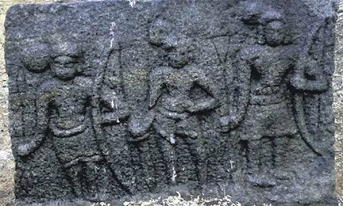 வீரர்களின் நினைவாக நடுகல் நடும் பழக்கம் பழங்கால தமிழர்களிடம் இருந்து வந்தது. மூன்று வீரர்களின் புடைச்சிற்பத்துடன் கூடிய வீர நடுகல் சிவகங்கை அருகே மேலப்பூங்குடி கண்மாய் கரை அருகே உள்ளது. மூன்றடி நீளம், இரண்டடி உயரம் கொண்டது. மூன்று வீரர்களும் தலையில் கொண்டையுடன் பத்தரகுண்டலத்தை காதணியாக அணிந்துள்ளனர். உடைகளில் மாறுபாடு இருக்கிறது. நடுவில் உள்ள வீரனின் வலதுகையில் வாள் உள்ளது. மற்ற வீரர்களிடம் இடது கையில் வில், வலது கையில் நீண்ட ஆயுதம் உள்ளன.