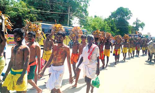 மேலுார்: மேலுார் அருகே மீனாட்சிபுரத்தில், 18 சித்தர்களில் முதல்வராக கருதப்படும் காகபூசிந்த ரிஷி சித்தர் ஜீவசமாதி உள்ளது. கடந்த 15 நாட்களாக ஆண் பக்தர்கள் காப்பு கட்டி விரதம் இருந்தனர். நிறைவு நாளான நேற்று மேலுாரில் இருந்து வாழைப்பழங்களை தலையில் சுமந்து சென்று படையல் இட்டனர். ஆண் பக்தர்கள் மட்டுமே இதில் கலந்து கொள்வர்.