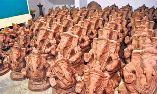 திண்டுக்கல், திண்டுக்கல்லில் விநாயகர் சதுர்த்தியை முன்னிட்டு களிமண் விநாயகர் சிலைகள் தயாரிக்கும் பணி மும்முரமாக நடக்கிறது. வேடப்பட்டி அருகே களிமண்ணில் விநாயகர் சிலைகள் தயாரித்து விற்பனை செய்கின்றனர். அரை அடி முதல் 3 அடி வரை சிலைகள் தயார் செய்கின்றனர். இங்கிருந்து சேலம், உடுமலைப்பேட்டை, திருச்சிக்கு அதிகம் விற்பனைக்கு அனுப்பப்படுகின்றன. இயற்கையான வண்ணங்கள் பூசி, ரூ.100 முதல் ரூ.500 வரைக்கும் விற்கின்றனர். தேவைக்கு ஏற்ப ஆர்டருக்கும் செய்து தருகின்றனர். இன்னும் 3 வாரங்களே இருப்பதால், விநாயகர் சிலைகள் தயாரிக்கும் பணி மும்முரமாக நடக்கிறது. வியாபாரி அய்யப்பன் கூறுகையில், தண்ணீர் பற்றாக்குறையால் விலைக்கு தண்ணீர் வாங்கி சிலைகள் செய்கிறோம். களிமண்ணால் செய்வதால் தண்ணீரில் கரைக்கையில் மாசு ஏற்படாது. மேலும், இயற்கை வண்ணங்களை மட்டுமே பயன்படுத்துகிறோம், என்றார்.