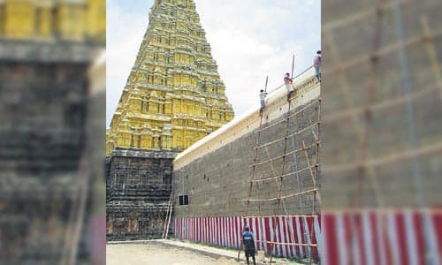 காஞ்சிபுரம்: காஞ்சிபுரம் வரதராஜ பெருமாள் கோவில், மதில் சுவரின் மேற்பகுதி, பாரம்பரிய முறைப்படி சீரமைக்கும் பணி நடந்து வருகிறது. காஞ்சிபுரத்தில், உள்ள வைணவ கோவில்களில் முக்கியமானதாகவும், புராண சரித்திரப் பெருமைகளை கொண்டது, வரதராஜப்பெருமாள் கோவில்.விஜய நகர பேரரசின் ஆட்சி காலத்தில், இக்கோவிலில் பல கட்டடங்கள் கட்டப்பட்டன. அவற்றில் முக்கியமானது, 100 கால் மண்டபம்.இக்கோவில் கிழக்கு, மேற்கு, வடக்குப்புற மதில் சுவரின் மேற்பகுதியில், சுண்ணாம்பு கலவை மூலம் (கோப்பிங்) பாரம்பரிய முறைப்படி சீரமைக்கப்படுகிறது.மதில் சுவரின், 3,882 மீட்டர் நீளத்திற்கு, 19 லட்சம் ரூபாய் மதிப்பீட்டில், பணி நடந்து வருகிறது என, கோவில் உயரதிகாரி ஒருவர் தெரிவித்தார்.