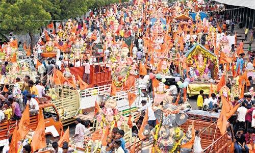 திருப்பூர் : இந்து முன்னணி சார்பில், விநாயகர் சிலைகள் விசர்ஜன ஊர்வலம், திருப்பூரில் நேற்று நடைபெற்றது. ரோடுகளில், எங்கு பார்த்தாலும் விநாயகர் சிலைகளே தென்பட்டன. விநாயகர் சதுர்த்தியை முன்னிட்டு, இந்து முன்னணி சார்பில், திருப்பூர் மாநகர பகுதிகளில், 1,654 சிலைகள், கடந்த, 25ல் பிரதிஷ்டை செய்யப்பட்டன. தொடர்ந்து, நான்கு நாட்களும், தினமும் சிறப்பு பூஜைகள் நடந்தன. கலாச்சார விளையாட்டு போட்டிகள், கிராமிய கலை நிகழ்ச்சிகள், அன்னதானம் உள்ளிட்டவற்றுக்கும் ஏற்பாடு செய்யப்பட்டிருந்தது. இதை தொடர்ந்து, பிரதிஷ்டை செய்யப்பட்ட விநாயகர் சிலைகள், நேற்று, மேளதாளம் முழங்க, முக்கிய வீதிகள் வழியாக ஊர்வலமாக எடுத்து வரப்பட்டது. திருப்பூர் புதிய பஸ் ஸ்டாண்ட், தாராபுரம் ரோடு மற்றும் செல்லம் நகர் பகுதிகளில் இருந்து, ஊர்வலம் துவங்கியது. பல்வேறு பகுதியில் நடந்த ஊர்வலத்துக்கு, இந்து முன்னணி மாநில தலைவர் சுப்ரமணியம் தலைமை வகித்தார். மாநில செயலாளர்கள் கிஷோர் குமார், தாமு வெங்கடேஸ்வரன், மாநில அமைப்பாளர் பக்தன், சினிமா இயக்குனர் கஸ்தூரிராஜா உள்ளிட்டோர் பங்கேற்றனர்.