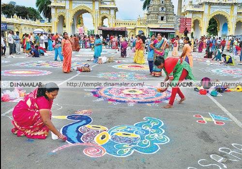கோலமிட்டு பெண்கள் அசத்தல் : தசராவுக்காக நடத்தப்பட்ட கோலப்போட்டியில், மைசூரு, துமகூரு, நஞ்சன்கூடு, நெலமங்களா, சாம்ராஜா நகர் உட்பட பல பகுதிகளிலிருந்து, 85க்கும் மேற்பட்ட பெண்கள் பங்கேற்றனர். இதில், முக்கியமாக,மைசூரு தேவராஜ் ெமாஹல்லாவை சேர்ந்த, 80 வயது மூதாட்டியும் பங்கேற்றது குறிப்பிடத்தக்கது.