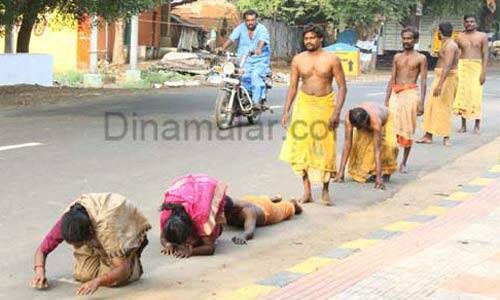 கிரிவலப் பாதையில் பாத நமஸ்காரம் செய்யும் திருப்பூர் பக்தர்கள்