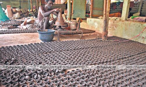 புதிய டிசைன்கள்: களி மண்ணால் செய்யப்பட்ட மனை விளக்கு ரூ.120, வர்ணம் பூசியது ரூ.200, பெரிய மனை விளக்கு ரூ.500, உருளி விளக்கு ரூ.150, சாமி சிலை வைத்த உருளி விளக்கு ரூ.200, 5 விளக்குகள் கொண்ட தாமரை விளக்கு ரூ.100 என புதிய டிசைன்களில் விற்பனைக்கு தயாராகி வருகின்றன. வியாபாரி ஒருவர் கூறுகையில், மண்ணால் செய்யப்படும் பொருட்களின் செய்கூலி, விற்கும் விலையை விட அதிகம். ஆனாலும், மக்கள் மத்தியில் மண்ணால் செய்யப்படும் பொருட்களுக்கு வரவேற்பு இருப்பதால், இந்த தொழிலை தொடர்ந்து செய்து வருகிறோம். மண் பாண்ட கலையும், தொழிலும் அழியாமல் இருக்க அரசு உதவி செய்ய வேண்டும் என்றார்.