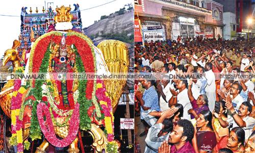 வடம் பிடித்து இழுக்க கிரிவீதி, ரத வீதிகளில் தேரோட்டம் நடக்கும். மாலை