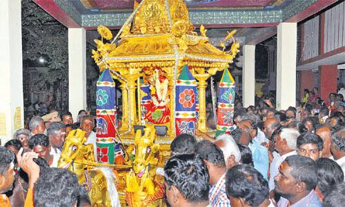 திருப்புவனம்: சிவகங்கை மாவட்டம் மடப்புரம் பத்ரகாளியம்மன் கோயிலில் நேற்று முதல் தங்க தேரோட்டம் தொடங்கியது. இக் கோயிலில் கடந்த சில மாதங்களுக்கு முன் கும்பாபிஷேகம் நடந்தது. பக்தர்கள் அம்மனுக்கு நேர்த்திக்கடன் செலுத்த தங்க தேர் உருவாக்க வேண்டும் என்பது நீண்ட கால கோரிக்கை இருந்து வந்தது. இதனையடுத்து கடந்த சில ஆண்டுகளாக தங்க தேர் செய்யப்பட்டு வெள்ளோட்டமும் விடப்பட்டது. நேற்று தங்க தேர் கோயில் வளாகத்தில் சிறப்பு பூஜைக்கு பின் வலம் வந்தது. கோயில் செயல் அலுவலர் செல்வி, அறங்காவலர் குழு தலைவர் ஜெய்சங்கர், அறங்காவலர் குழு உறுப்பினர்கள் மற்றும் பக்தர்கள் தேரை இழுத்தனர். அறங்காவலர் குழு தலைவர் ஜெய்சங்கர் கூறுகையில, பக்தர்கள் வேண்டுதல் நிறைவேற தங்கதேர் நாளை முதல் இழுக்கலாம். நபர் ஒன்றுக்கு 2 ஆயிரம் ரூபாய் கோயில் அலுவலகத்தில் செலுத்தி தேர் இழுக்கலாம், ஒன்றுக்கு மேற்பட்ட பக்தர்கள் பணம் செலுத்தும் பட்சத்தில் நான்கு திசைகளுக்கும் தலா ஒருவர் என்ற வீதத்தில் தங்க தேர் இழுக்க அனுமதிக்கப்படுவார்கள், என்றார்.