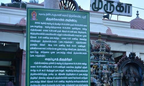 பழநி: கிட்டத்தட்ட, 60 ஆண்டுகளுக்கு பின், தைப்பூசத்தன்று சந்திர கிரகணம் வருவதால், பழநி கோவில் நடை, மாலையில் அடைக்கப்படுவதால், தேரோட்டம் காலையில் நடக்கிறது. பழநி முருகன் கோவில் தைப்பூசத் திருவிழா, 2018ம் ஆண்டு ஜன., 25ல் துவங்கி, பிப்., 3 வரை நடக்கிறது. முக்கிய நிகழ்ச்சியாக, ஜன., 30ல், திருக்கல்யாணமும், ஜன., 31ல் தைப்பூசத்தன்று தேரோட்டமும் நடக்கிறது. இந்தாண்டு தைப்பூசம் பவுர்ணமி அன்று, சந்திர கிரகணம் மாலை, 6:22 முதல் இரவு, 8:41 வரை நிகழ்கிறது. இதனால், தேரோட்டம் பகல், 11:00 மணிக்கு நடக்கிறது. கோவிலில், மாலை, 5:30 மணிக்கு நடைபெறும் சாயரட்சை பூஜை, மதியம், 2:45 மணிக்கு துவங்கி, 3:45 மணிக்கு நடை அடைக்கப்படுகிறது. ஏறத்தாழ, 60 ஆண்டுகளுக்கு முன், தைப்பூசத்தன்று சந்திர கிரகணம் வந்து, பகலில் தைப்பூச தேரோட்டம் நடந்ததாக, கோவில் அதிகாரிகள் கூறுகின்றனர்.