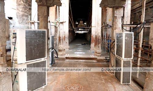 திருச்சி: திருச்சி, ஸ்ரீரங்கம் ரெங்கநாதர் கோவிலில் நடைபெறும், நம்பெருமாள் - தாயார் சேர்த்தி சேவையை தரிசிக்க வரும் பக்தர்களுக்காக, குளிர் சாதன வசதி செய்யப்பட்டுள் ளது.குளிர் சாதனங்கள்இது குறித்து, கோவில் இணை ஆணையர், ஜெயராமன் கூறியதா வது:திருச்சி, ஸ்ரீரங்கம் ரெங்கநாதர் கோவிலில், (மார்ச்,30) மாலை, 3:30 மணி முதல், நம்பெருமாள் - ரெங்கநாயகி தாயார் சேர்த்தி சேவை நடைபெற உள்ளது. கோடை காலத்தில் நடைபெறும் சேர்த்தி சேவையின் போது, வெப்பத்தின் தாக்கம் காரணமாக, வயதான பக்தர்கள், குழந்தைகள் மிகவும் சிரமப்பட்டனர்.அதனால், பக்தர்கள் வசதிக்காக, கடந்த ஆண்டு, முதல் முறையாக, சேர்த்தி சேவை தரிசனத்துக்கு, தாயார் சன்னதிக்கு, பக்தர்கள் வரிசையில் செல்லும் பகுதியில், குளிர் சாதன வசதி செய்யப்பட்டது.அதே போல, இந்த ஆண்டும், (மார்ச்,30) நடைபெறும், சேர்த்தி சேவை தரிசனத்துக்கு வரும் பக்தர்கள் வசதிக்காக, தாயார் சன்னதி, முன் மண்டபத்தில் இருந்து, சேர்த்தி சேவை மண்டபம் வரை, 5 டன் திறன் கொண்ட, 12 குளிர் சாதனங்கள் பொருத்தப்பட்டுள்ளன.நேரடி ஒளிபரப்புஓரிடத்தில் மிகப் பெரிய ஏர் கூலரும், தாயார் சன்னதி, முன் மண்டபத்தில், 30 மின் விசிறிகளும் பொருத்தப்பட்டுள்ளன. தன்வந்திரி சன்னதி, கம்பர் மண்டபம் அருகில் பிரமாண்ட திரையில், சேர்த்தி சேவை நேரடி ஒளிபரப்பு செய்யவும் ஏற்பாடு செய்யப்பட்டுள்ளது.இவ்வாறு, அவர் தெரிவித்தார்.