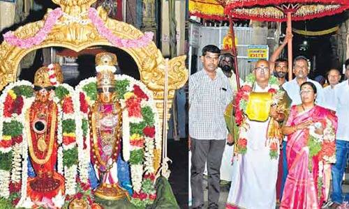 ஸ்ரீவில்லிபுத்தூர்:ஸ்ரீவில்லிபுத்தூரில் இன்று (மார்ச் 30) மாலை நடக்கும் திருக்கல்யாணத்தில், ஆண்டாளுக்கு சாற்றுவதற்காக, திருப்பதி கோயில் சார்பில் பட்டு வஸ்திரம் மற்றும் மங்கலபொருட்கள் கொண்டு வரப்பட்டன.இதை, (மார்ச் 29) காலை 10:20 மணிக்கு திருப்பதி கோயில் பேஷ்கார் ரமேஷ்பாபு தலைமையிலான குழுவினர் கொண்டு வந்தனர். கோயில் யானை முன்செல்ல, மாடவீதிகளை சுற்றி வந்த பட்டு மற்றும் மங்கலபொருட்களை செயல் அலுவலர் நாகராஜன், வேதபிரான் சுதர்சன், ஸ்ரீவாரிபிரபு, மணியம் ஸ்ரீராம், கோபி, ஸ்தானிகம் ரமேஷ் பெற்றனர்.இன்று (மார்ச் 30) மாலை 6:35 மணிக்கு, ஆடிப்பூர பந்தலில் நடக்கும் ஆண்டாள் திருக்கல்யாணத்தின்போது, ஆண்டாளுக்கு இந்த பட்டு சாற்றப் படுகிறது. ஏற்பாடுகளை தக்கார் ரவிசந்திரன், செயல்அலுவலர் செய்துள்ளனர்.