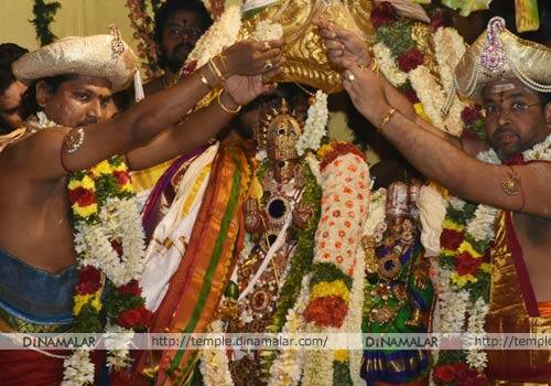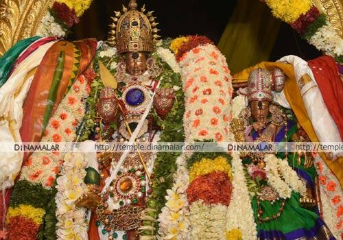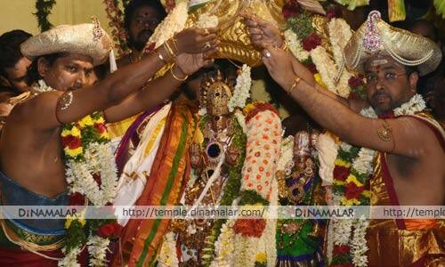 திருக்கல்யாணம்: கண்ணூஞ்சல் நிகழ்ச்சி முடிந்து ஆறுகால் பீடத்தில் முதலில் மீனாட்சி அம்மன், பிரியாவிடை, சுந்தரேஸ்வரரை தொடர்ந்து சுப்பிரமணிய சுவாமி, தெய்வானை எழுந்தருளினர். தங்கம், வெள்ளி குடங்களில் புனிதநீர் நிரப்பி, பூஜைகள் நடந்தன. மாங்கல்ய பூஜைக்குப்பின்பு, சுவாமிகளுக்கு புத்தாடைகள் அணிவிக்கப்பட்டன. சுப்பிரமணிய சுவாமிக்கு வெண் பட்டும், தெய்வானைக்கு பச்சை பட்டும் சாத்துப்படியானது. மீனாட்சி அம்மன், சொக்கநாதர், பிரிவியாவிடையிடம் திருமாங்கல்யம் ஆசி பெறப்பட்டு, சுப்பிரமணிய சுவாமி, தெய்வானை திருக்கல்யாணம் நடந்தது. அம்மி மிதித்து அருந்ததி பார்த்தபின்பு தீபாராதனைகள் நடந்தது.