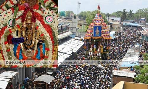 திருச்சி: திருச்சி, சமயபுரம் மாரியம்மன் கோவிலில், நடந்த சித்திரை தேரோட்டத்தில் பல்லாயிரக்கணக்கான பக்தர்கள் பங்கேற்றனர். பிரசித்தி பெற்ற சக்தி தலமான திருச்சி சமயபுரம் மாரியம்மன் கோவிலில், உலக நன்மைக்காக மாரியம்மனும், பக்தர்களும், 28 நாட்கள் கடைப்பிடித்த பச்சைப் பட்டினி விரதம், 8ம் தேதியுடன் நிறைவடைந்தது. அதை தொடர்ந்து சித்திரை தேர் திருவிழா தொடங்கியது. நேற்று விழாவின் முக்கிய நிகழ்வான தேரோட்டம் நடைபெற்றது. நேற்று காலை, 11:30 மணிக்கு தேர் வடம் பிடிக்கப்பட்டது. ஆயிரக்கணக்கான பக்தர்கள், பராசக்தி கோஷத்துடன் தேர் வடம் பிடித்து இழுத்தனர். முக்கிய வீதிகள் வழியாக வலம் வந்த தேர், நிலையை அடைந்தவுடன், உற்சவர் அம்மனுக்கு சிறப்பு தீபாராதனை நடந்தது.