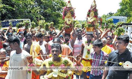 ஆனைமலை;ஆனைமலை மதுரைவீரன் கோவில் திருவிழாவில், பக்தர்கள் தீர்த்தம் எடுத்து வழிபாடு செய்தனர்.ஆனைமலை மதுரை வீரன்கோவில் திருவிழாவில், நேற்று அதிகாலை, 3:00 மணிக்கு, சேத்துமடை காளியம்மன் கோவிலில் இருந்து, பக்தர்கள் அலகு குத்தி, தீர்த்தம்எடுத்து வந்தனர்.பேரூராட்சி அலுவலகம் அருகேயுள்ள ஐயப்பன் கோவில் வழிபாடு முடிந்ததும், காலை, 11:00 மணிக்கு மதுரைவீரனுக்கு தீர்த்த அபிஷேகம் செய்து வழிபாடு செய்தனர். பக்தர்களுக்கு கோவில் வளாகத்தில்,அன்னதானம் நடந்தது.இன்று, 8ம் தேதி மாலை, 5:00 மணிக்கு ஆழியாற்றங்கரையில் இருந்து சக்தி கும்பத்துடன், பூவோடு எடுக்கும் நிகழ்ச்சி நடக்கிறது. 9ம் தேதி காலை திருக்கல்யாணம் மற்றும் மாலையில்மாவிளக்கு எடுக்கப்படுகிறது.வரும், 10ம் தேதி அபிஷேகம், அலங்கார வழிபாடும், 11ம் தேதி மஞ்சள் நீராடலும் நடக்கிறது.