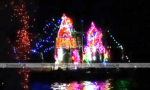 தஞ்சாவூர் மாவட்டம் அதிராம்பட்டினம் அடுத்த கழுமங்குடா கிராமம் கரையூர் தெருவில் அமைந்துள்ள சக்தி விநாயகர் கோவில் திருவிழா கடந்த 10 தினங்களாக நடைபெற்று வருகிறது. இந்நிலையில், இன்று அதிகாலை தெப்ப திருவிழா நடைபெற இருந்தது. சமீப காலமாக இப்பகுதியில் மழை பெய்யாததால் ஏரி, குளங்கள் தண்ணீரில்லாமல் வறண்ட நிலையில் கிடந்தது. குளங்களில் தண்ணீரில்லாமல் எப்படி தெப்பத் திருவிழாவை கொண்டாடுவது என்று யோசித்த கிராமத்தார்கள் கடலில் தெப்பத் திருவிழா நிகழ்ச்சி நடத்தலாம் என்று முடிவு செய்தனர். இதையடுத்து 3 பைபர் படகுகளை ஒன்றாக கட்டி அதில் அலங்கரிக்கப்பட்ட சாமியை வைத்து வண்ண விலக்குகள் எரிய வாணவேடிக்கைகளுடன் இன்று அதிகாலை 3 மணியளவில் கடலில் வளம் வந்தது. இந்த நிகழ்ச்சி பார்ப்பதற்கு கண்ணுக்கு விருந்தாக அமைந்ததால் கடற்கரையோர கிராமங்கள் மட்டுமல்லாமல் மற்ற பகுதி மக்களும் நேரில் வந்து கண்டு ரசித்தனர். சுற்றுவட்டாரப் பகுதிகளிலேயே கடலில் தெப்பத் திருவிழா நடைபெற்றது இதுவே முதன் முறையாககும் என்றனர் கிராமத்தினர்.
