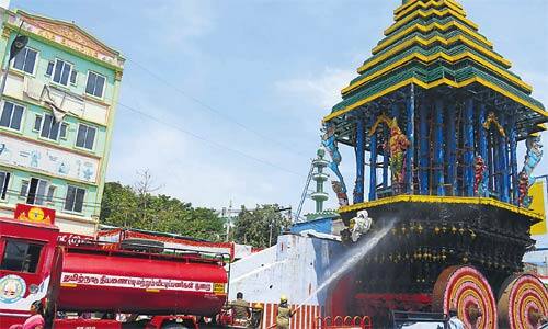 காஞ்சிபுரம்:காஞ்சிபுரம் வரதர் கோவில் தேரோட்டம், ஜூன் 2ல், நடைபெறவுள்ளதையொட்டி, தீயணைப்பு வீரர்கள் நேற்று, தண்ணீரை பீய்ச்சி அடித்து, தேரை சுத்தப்படுத்தும் பணியில் ஈடுபட்டனர். காஞ்சிபுரம் வரதராஜ பெருமாள் கோவில் வைகாசி பிரம்மோற்சவம், மே, 27ல் கொடியேற்றத்துடன் துவங்கியது. நேற்று முன்தினம், மூன்றாம் நாள் பிரபல உற்சவமான கருடசேவை, வெகு விமரிசையாக நடந்தது. ஜூன், 2ல், காலை, 6:00 மணிக்கு ஏழாம் நாள் உற்சவமான, தேரோட்டம் நடைபெறவுள்ளது. இதற்காக, சில நாட்களுக்கு முன், வெயில், மழையில் நனையாமல் இருக்க, தேரின் பாதுகாப்புக்காக மூடப்பட்டிருந்த தகடுகள் பிரித்து எடுக்கப்பட்டன. அப்பகுதியில் இருந்த ஆக்கிரமிப்பு கடைகள் அப்புறப்படுத்தப்பட்டன. தேரின் மீது படிந்திருந்த துாசு, துகள்களை, காஞ்சிபுரம் தீயணைப்பு வீரர்கள், நேற்று காலை, தண்ணீரை பீய்ச்சி அடித்து சுத்தம் செய்தனர்.இதையடுத்து, தேர் அலங்கார பணிகள் துவங்கியுள்ளன.