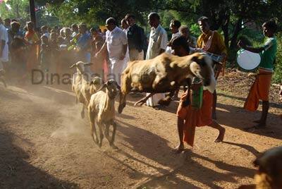 திருப்புத்தூர்: மாட்டுப் பொங்கல் என்றால் பொங்கலிட்டு மாடு விரட்டுவது என்பது கிராமத்தில் தொன்று தொட்டு நடந்து வரும் வழக்கம். மாடு மட்டுமல்ல ஆடுகளையும் விரட்டத்தான் செய்கிறார்கள். கடந்த மாட்டுப்பொங்கலன்று சிவகங்கை மாவட்டம் திருப்புத்தூர் ஒன்றியம் மாங்குடியில் கிராமத்தினர் பகல் 2 மணிக்கு மந்தையில் கூடினர். அங்கு சாமி அழைப்பு நடந்தது. கிராம பூஜாரிக்கு சாமி வந்ததால் அங்கிருந்த ஆடுகள் அடைக்கப்பட்ட தொழுவிற்கு வந்தார். முதலில் ஊர்ப் பொதுவிற்கு வளர்க்கப்படும் ஆடுகள் உள்ள தொழுவை சுற்றி வந்து வழிபாடு நடத்தினர். பின்னர் வீடுகளில் வளர்க்கப்படும் வளர்ப்பு ஆடுகளை வழிபட்டனர். பின்னர் வாத்தியங்கள் முழங்க ஆடுகளை அவிழ்த்து விரட்டினர். கூடியிருக்கும் சிறுவர்கள் உற்சாகத்துடன் ஆடுகளை பிடிக்க முயன்றனர். ஆடுகள் துள்ளி குதித்து ஓடி அவர்களிடமிருந்து தப்பிக்க முயன்றன. பின்னர் கோயில் வீட்டிற்கு சென்று வழிபட்டபின் வீடு வாசல் முன்பு பொங்கலிட்டனர். பின்னர் வழக்கமான முறையில் மாடு அவிழ்ப்பும் நடந்தது.