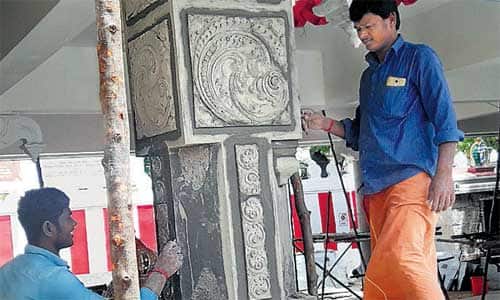 காரமடை: காரமடை அரங்கநாதர் கோவிலில் உள்ள துாண்களில் அலங்கார வேலை செய்யப்படுகிறது. கோவை மாவட்டத்தில் மிகவும் பிரசித்தி பெற்ற வைணவ ஸ்தலம், காரமடை அரங்கநாதர் கோவில். இக்கோவிலில் ஏழுநிலை ராஜகோபுரம் அமைத்து, திருப்பணி செய்து, 2015, ஜூன், 7ல் மகாகும்பாபிேஷகம் செய்யப்பட்டது. ராஜகோபுர முன்மண்டபம், திருக்கல்யாண மண்டபம், பக்தர்கள் நடைபாதை சுற்று மண்டபம் ஆகியவை கான்கிரீட்டில் அமைக்கப்பட்டுள்ளன. இங்குள்ள துாண்களில், எவ்வித அலங்கார வேலை பாடும் இன்றி உருண்டை வடிவில் உள்ளன. அதில், தாயார் சன்னதி முன்புள்ள திருக்கல்யாண மண்டபத்தில், 16 துாண்களுக்கு அலங்கார வேலையை நன் கொடையாக செய்து கொடுக்க, கோவையை சேர்ந்த ராமசாமி என்கிற பக்தர்முன் வந்துள்ளார். இந்து சமய அறநிலையத்துறை அனுமதி அளித்தை தொடர்ந்து, துாண்களில் அலங்கார வேலை துவக்கப்பட்டு உள்ளது.