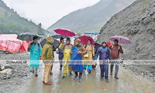ஸ்ரீநகர்,:ஜம்மு - காஷ்மீர் மாநிலத்தில், பலத்த மழை பெய்ததால், அமர்நாத் யாத்திரை துவங்கிய முதல் நாளிலேயே, தற்காலிகமாக நிறுத்தப்பட்டுள்ளது.ஜம்மு - காஷ்மீரில், கவர்னர் ஆட்சி நடக்கிறது. இங்குள்ள அமர்நாத் குகையில் உருவாகும் பனி லிங்கத்தை, லட்சக்கணக்கான பக்தர்கள் தரிசித்து செல்வர். இந்த ஆண்டு, அமர்நாத் யாத்திரைக்கு, 1.96 லட்சம் பக்தர்கள் பதிவு செய்துள்ளனர்.கடந்த ஆண்டு, அமர்நாத் யாத்திரை பக்தர்கள் மீது நடந்த பயங்கரவாத தாக்குதலில், எட்டு பேர் உயிரிழந்ததையடுத்து, இந்த ஆண்டு, பலத்த பாதுகாப்புடன் யாத்திரை நடத்தப்படுகிறது. நேற்று முன்தினம், ஜம்முவில் இருந்து, 107 வாகனங்களில், 2,995 பக்தர்கள், யாத்திரைக்கு புறப்பட்டனர். பஹல்காம் மற்றும் பால்தால் முகாம்களுக்கு சென்றடைந்த பின், இரண்டு குழுக்களாக பிரிந்து, பனி லிங்கத்தை தரிசிக்க, பாத யாத்திரையாக செல்ல வேண்டும்.இந்நிலையில், நேற்று முன்தினம் மாலை, பலத்த மழை பெய்ததால், பக்தர் கள் தொடர்ந்து செல்வதற்கு தடை விதிக்கப்பட்டது. பக்தர்கள் அனைவரும், முகாம்களில் தங்க வைக்கப்பட்டுள்ளனர்.அடுத்த, 48 மணி நேரத்துக்கு, மாநிலத்தில் பலத்த மழை பெய்யும் என, இந்திய வானிலை ஆய்வு மையம் எச்சரித்துள்ளதால், யாத்திரை மீண்டும் துவங்குவதில் சிக்கல் ஏற்பட்டுள்ளது.