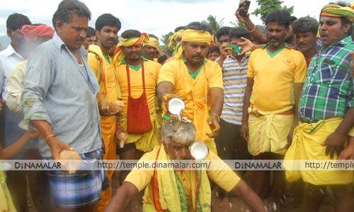 ஒவ்வொரு ஆண்டும், ஆடிப்பெருக்கன்று, அருகேவுள்ள நீர்நிலைகளுக்கு, வீரபத்திரசுவாமியை எடுத்து சென்று சிறப்பு பூஜை செய்து, தலையில் தேங்காய் உடைத்து பக்தர்கள் நேர்த்திக்கடன் செலுத்துவது வழக்கம். காலை, 10:00 மணிக்கு கோவிலில் இருந்து, வீரபத்திரசுவாமி மற்றும் சித்தப்பன், ஜடையப்பன், பாவாடராயன், தொட்டிலிபீரம்மாள், பட்டக்காரன், குப்பதப்பன் உள்ளிட்ட சுவாமி சிலைகள், அப்பகுதியில் உள்ள பெரிய ஏரிக்கு ஊர்வலமாக மக்கள் எடுத்து வந்தனர். அங்கு, சிலைகளுக்கு சிறப்பு அலங்காரம் மற்றும் அபி ேஷகம் செய்யப்பட்டு, சக்தி அழைத்தல் நிகழ்ச்சி நடந்தது. இதையடுத்து, பக்தர்கள் தங்கள் தலையில் தேங்காய் உடைத்து, நேர்த்திக்கடன் நிறைவேற்றினர். விழாவில், பக்தர்களுக்கு சாட்டையடி வழங்கப்பட்டது. சுற்று வட்டாரப் பகுதிகளை சேர்ந்த, ஆயிரத்திற்கும் மேற்பட்டோர் பங்கேற்றனர்.