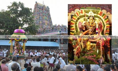 செப்.,4ல் கொடியேற்றத்துடன் விழா துவங்கியது. நேற்று (செப்.,9ல்) ஆறாம் திருநாளை முன்னிட்டு கஜமுகசூரசம்ஹாரம் நடந்தது. சிவனிடம் அழியா வரம் பெற்ற கஜமுக சூரன் தேவர்களை அச்சுறுத்தி வந்தான். சூரனிடமிருந்து தேவர்களை காப்பாற்ற விநாயகர் அவனை வதம் செய்ததாக ஐதீகம். அதனை முன்னிட்டு நேற்று (செப்.,9ல்) மாலை 6:00 மணிக்கு தங்கக் கவசத்தில் மூலவருக்கும், சூரனை வதம் செய்யும் தந்தத்திற்கும் சிறப்பு பூஜைகள் நடந்தன. பின்னர் யானை வாகனத்தில் சுவாமி கோயிலை வலம் வந்தார்.
