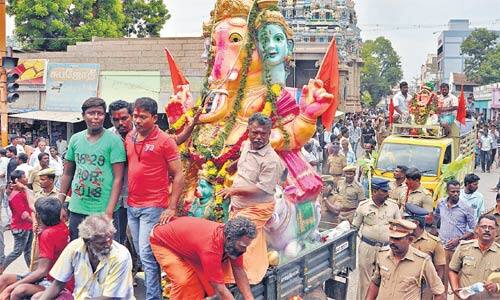 விருதுநகர்:அருப்புக்கோட்டையில் ஹிந்து முன்னணி சார்பில் விநாயகர் சதுர்த்தியை முன்னி ட்டு விநாயகர் ஊர்வலம் நடந்தது. நகர் முழுவதும் இருந்து 13 விநாயகர் சிலைகள் கொண்டு வரப்பட்டு, அருப்புக்கோட்டை பெரியகுளம் கண்மாயில் கரைக்கப்பட்டது. ஏராளமான பக்தர்கள் பங்கேற்றனர். 1000 க்கும் மேற்பட்ட போலீசார் பாதுகாப்பு பணியில் ஈடுபட்டிருந்தனர். அருப்புக்கோட்டை- பந்தல்குடி ரோட்டில் ஹிந்து முன்னணி சார்பில் பொதுக்கூட்டமும் நடந்தது.