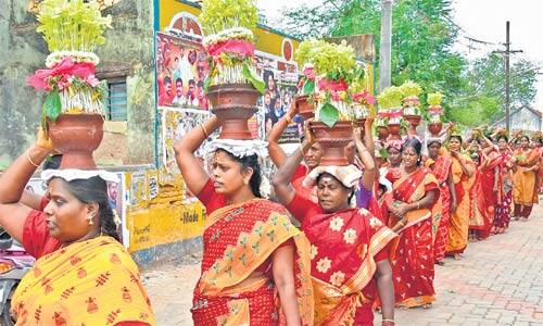 சிவகங்கை: மேல்மருத்தூர் ஆதிபராசக்தி மன்றம் சார்பில் பெண்கள் முளைப்பாரி, கஞ்சி கலயம் எடுத்துச்சென்றனர்.