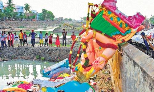 ஊரணியில் போதுமான தண்ணீர் இல்லை. மோட்டார் வைத்து தண்ணீரை பள்ளங்களில் சேகரித்தனர். அப்படி இருந்தும் ஊரணியில் முழங்கால் அளவே தண்ணீர் இருந்தது. வேறு வழியின்றி அதில் 39 விநாயகர் சிலைகளும் கரைக்கப்பட்டன. இதனால் பக்தர்கள் வேதனை அடைந்தனர்.