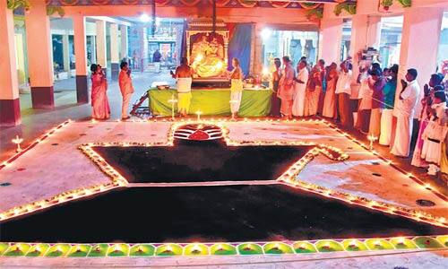 சிவகங்கை: கார்த்திகை தீப திருநாளை முன்னிட்டு சிவகங்கை விஸ்வநாதர் கோயிலில் சிவலிங்க வடிவில் விளக்குகள் ஏற்றப்பட்டு சிறப்பு தீபாராதனை நடந்தது.