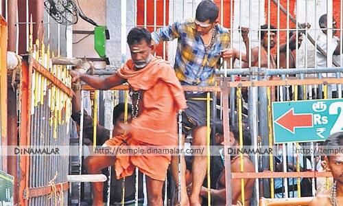 பழநியில் காத்திருந்த பக்தர்கள் ஏறிக்குதிப்பதால் ஆபத்து