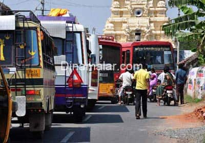 செஞ்சி: மேல்மலையனூர் கோவிலுக்கு செல்கின்ற வாகனங்கள் வருவதற்கும், போவதற்கும் ஒரே வழியை பயன்படுத்துவதால் பக்தர்கள் மிகுந்த அவதிக்கு ஆளாகின்றனர். செஞ்சியிலிருந்து மேல்மலையனூர் செல்லும் வழியில் வளத்தியில் உள்ள குறுகலான திருப்பத்தில் போக்குவரத்து நெரிசல் ஏற்படுகிறது. இதனை தவிர்க்க உரிய நடவடிக்கைகளை போலீசார் மேற்கொள்ள வேண்டும்.மேல்மலையனூர் அங்காளம்மன் கோவிலின் பிரசித்தி பெற்ற மாசி திருத்தேர் உற்சவம் நேற்று முன்தினம் துவங்கியது. காலை 7.30 மணிக்கு கோபால விநாயகர் பூஜையும், இரவு 9 மணிக்கு கொடியேற்றமும், காப்பு கட்டுதல் நிகழ்ச்சியும் நடந்தது. நேற்று காலை 10.30 மணியளவில் மயான கொள்ளை நிகழ்ச்சி நடந்தது. இதில் ஆயிரக்கணக்கான பக்தர்கள் தமிழகத்தின் பல்வேறு பகுதிகளிலிருந்தும் வந்து கலந்து கொண்டனர். செஞ்சியில் இருந்து மேல்மலையனூர் அங்காளம்மன் கோவிலுக்கு செல்வதற்கு வளத்தி வழியே பிரதானமாக உள்ளது. இதே வழியில் வேலூர், வந்தவாசி மார்க்கத்தில் இருந்து வரும் வாகனங்களும் செல்கின்றன.இதில் வளத்தி கிராமத்தின் வழியாக செல்லும் போது ஜெயின் கோவில் அருகே குறுகலான வளைவு ஒன்று உள்ளது. இந்த வளைவை நேராக மாற்றுவதற்கு இடையூறாக மேற்கில் கோவில் சுற்று சுவரும், எதிர் புறம் ஓட்டு வீடு ஒன்றும் உள்ளது.இந்த வழியில் செல்லும் வாகனங்கள் திருப்பத்தில் மிக நிதானமாக செல்ல வேண்டிய நிலை உள்ளது. இதில் கவனிக்காமல் ஒரே நேரத்தில் இரண்டு வாகனங்கள் வரும் போது சிக்கல் ஏற்படுகிறது.நேற்று முன்தினம் மேல்மலையனூர் கோவிலில் மயானக்கொள்ளை நிகழ்ச்சிக்காக ஆயிரக்கணக்கான வாகனங்கள் இந்த வழியாக சென்று வந்தன. அனைத்து வாகனங்களும் வளத்தி வழியாக வந்து சென்றன. பெரும்பான்மையான வாகன ஓட்டிகளுக்கு வளத்தியில் உள்ள குறுகலான இடம் இருப்பது சரிவர தெரியாது.இதனால் அவசரப்பட்டு சென்ற வாகனங்கள் குறுகலான வளைவில் சிக்கியதால், நீண்ட தொலை விற்கு போக்குவரத்து பாதிக்கப்பட்டது. வாகனங்கள் நீண்ட தொலைவிற்கு வரிசையில் நின்றதால் போக்குவரத்து சீரடைவதில் காலதாமதம் ஏற்பட்டது.மேல்மலையனூரில் இருந்து செஞ்சி, வேலூர் மார்கமாக செல்வதற்கு சாத்தாம்பாடி கிராமம் வழியாக மாற்று வழிகள் உள்ளன. மேல்மலையனூரில் இருந்து திரும்பி வருகின்ற வாகனங்களை இந்த வழியாக திருப்பி அனுப்பி, வளத்தியில் போக்குவரத்து நெரிசலை தவிர்க்கலாம்.போலீசார் அனைத்து வாகனங்களையும் வளத்தி வழியில் சென்று வரும்படி செய்வதால் வளத்தியில் போக்குவரத்து நெரிசல் ஏற்படுகிறது. மேல்மலையனூர் அங்காளம்மன் கோவிலில் வரும் 24ம் தேதி மாலை தீமிதி விழாவும், 26ம் தேதி மாலை திருத்தேர் வடம் பிடித்தல் உற்சவம் நடக்க உள்ளது. இந்த விழாக்க