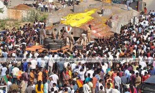 கர்நாடக மாநிலம், ஈஜிபுராவில், 108 அடி உயரத்தில் விஸ்வரூப கோதண்டராமர் சிலை அமைக்கப்பட உள்ளது. இதற்காக, 64 அடி உயரம், 26 அடி அகலம் கொண்ட பாறை, திருவண்ணாமலை மாவட்டம், வந்தவாசி அடுத்த, கொரக்கோட்டை மலையில் இருந்து, 350 டன் எடையில் வெட்டி எடுக்கப்பட்டது. முகம் மட்டும் வடிவமைத்து, கடந்த மாதம், 7ல், 240 டயர்கள் கொண்ட, கார்கோ லாரியில் சிலை புறப்பட்டது. கடந்த, 28ல் கோதண்டராமர் சிலை மத்தூர் வந்தது. அங்கிருந்த சென்டர் மீடியன் அகற்றப்பட்டு, 29ல் ஜெகதேவி தர்கா அருகே, லாரி நிறுத்தி வைக்கப்பட்டது. நேற்று காலை புறப்பட்ட லாரி, மதியம், 1:00 மணிக்கு, வேட்டியம்பட்டி வந்த போது, டயர்கள் வெடித்தன. அவற்றை மாற்றியபின், புறப்பட்ட லாரி, மதியம், 3:00 மணிக்கு, திருவண்ணாமலை மேம்பாலம் அருகே நிறுத்தி வைக்கப்பட்டது. அங்கு கூடியிருந்த மக்கள், சுவாமி தரிசனம் செய்தனர். மேம்பாலம் அருகே, தரைப்பாலம் அடியில், ராட்சத தடுப்புகளை பொருத்தும் பணிகள் நடந்து வருகின்றன. பணிகள் முடிந்த பின், ஆவின் மேம்பாலம் வழியாக, பெங்களூரு சாலைக்கு சிலை செல்லும். இதனால், திருவண்ணாமலை சாலையில் சென்ற வாகனங்கள், சென்னை சாலையில் திருப்பி விடப்பட்டன. போலீசார் பாதுகாப்பில் ஈடுபட்டிருந்தனர்.