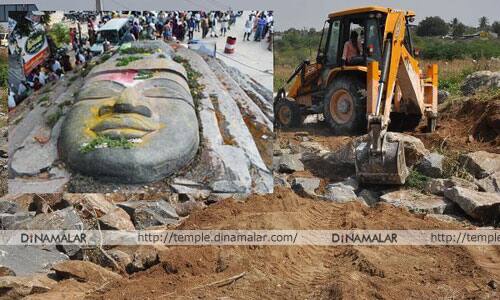சிங்காரப்பேட்டைசிலை செய்ய, 64 அடி உயரம், 26 அடி அகலம் உடைய கல், திருவண்ணாமலை மாவட்டம், கொரக்கோட்டை மலையில், 3.5 லட்சம் கிலோ எடையில், வெட்டி எடுக்கப்பட்டது.முகம், கைகள் மட்டும் வடிவமைக்கப்பட்டன. டிச.,7ல், 240 டயர்களால் வடிவமைக்கப்பட்ட, கார்கோ லாரியில் ஏற்றப்பட்ட சிலை, ஈஜிபுரா புறப்பட்டது. கடந்த, 16ல் கிருஷ்ணகிரி மாவட்ட எல்லையான, சிங்காரப்பேட்டைக்கு வந்தது.கிருஷ்ணகிரியில், நேற்று முன்தினம் ஆவின் மேம்பாலத்தை கடந்து, குந்தாரப்பள்ளியை அடுத்த, திப்பனப்பள்ளி சர்வீஸ் சாலையில் நிறுத்தப்பட்டது. மார்கண்டேய நதிகுருபரபள்ளியில் மேம்பாலம் உள்ளது. இதை கடக்க முடியாது என்பதால், அதை ஒட்டிச் செல்லும், மார்கண்டேய நதியில், தற்காலிக சாலை அமைக்கும் பணி, நேற்று காலை துவங்கியது.ஐந்து பொக்லைன் இயந்திரங்கள் உதவியுடன், ராட்சத கற்களை அடுக்கி, அவற்றின் மீது மண்ணைக் கொட்டும் பணி, தீவிரமாக நடந்து வருகிறது. இரண்டு நாளில் பணி முடியுமென்று தெரிகிறது.