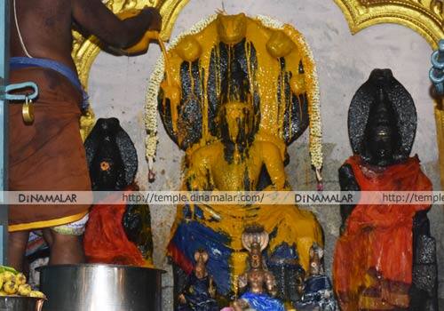 அதன்படி இன்று(பிப்.,13ல்) மதியம் 1.24 மணிக்கு ராகுபகவான் கடக ராசியிலிருந்து, மிதுன ராசிக்கு பெயர்ச்சி அடைந்தார். இதையொட்டி 7ம் தேதி முதல் 9ம் தேதி வரை முதற்கட்ட லட்சார்ச்சனையும், பின்னர் 14-ம் தேதி முதல் 16ம் தேதி வரை இரண்டாம் கட்ட லட்சார்ச்சனையும் நடைபெறவுள்ளது. 11-ம் தேதி கணபதி ஹோமத்துடன் யாகசாலை பூஜை தொடங்கிய நிலையில், இன்று பகல் 12 மணிக்கு மங்கள வாத்தியம் முழங்க கடம் புறப்பாடு நடந்தது. தொடர்ந்து மஞ்சள், திரவியம் போன்ற பொருட்களால் மகா அபிஷேகமும், சிறப்பு பாலாபிஷேகமும் செய்யப்பட்டு, சிறப்பு வழிபாடு செய்யப்பட்டது.