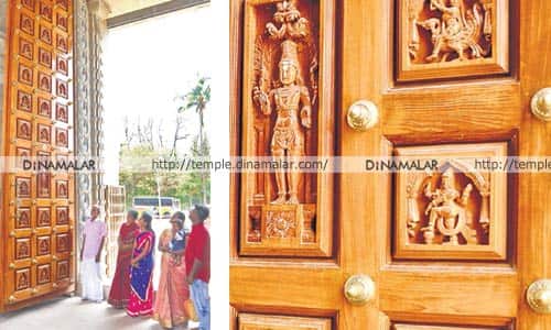 நுழைவுப்பகுதியில் 20 அடி ராஜகோபுர வலது புறம் கதவில், மரத்திலான சுவாமி சிற்பங்களான, சந்திரசேகர மூர்த்தி, தருண கணபதி, பாலகணபதி, சக்தி கணபதி, மயில்வாகனம், தேவசேனாதிபதி, கந்தர், பிரம்மா, சோமாஸ்கந்தர், நடராஜர், சரபேஸ்வரர், லட்சுமிநரசிம்மர் உள்ளிட்ட 32 சுவாமிகளும் மற்றும் இடது புறக்கதவில் மீனாட்சி உட்பட 31 தெய்வங்கள் அழகாக, பொன்னமராவதியைச் சேர்ந்த சேது ஸ்தபதி வடிவமைத்துள்ளார். இந்த இருகதவுகளையும் பக்தர்கள் ‘வைத்த கண் வாங்காமல்’ பார்த்து பிரமித்து போகின்றனர் என்பது கண்கூடு. காலை 6:00 மணி முதல் பகல் 12:00 வரை, மாலை 5:00 மணி முதல் 8:00 வரைக்கும் நடை திறந்து இருக்கும். அர்ச்சகர்கள் கார்த்தி, தினேஷ் பூஜைகள் செய்து வருகின்றனர்.