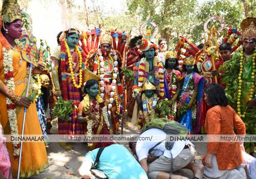 அண்ணாமலையார் மலை அடிவாரத்தில் உள்ள முலைபால் தீர்த்த குளம் அருகே துர்க்கையம்மன் கோவிலிலிருந்து, மயானகொள்ளை விழாவில் நேர்த்திக்கடன் செலுத்த ஏராளமான பக்தர்கள் பல்வேறு வேடமணிந்து வந்தனர். அவர்களின் காலில் விழுந்து வெளிநாட்டினர்கள் வணங்கி சென்றனர்.