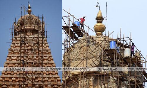 தஞ்சாவூர் பெரியகோவில் கட்டிட கலைக்கு சான்றாக விளங்குவதால்,யுனெஸ்கோ பராம்பாரிய சின்னமாக அறிவித்துள்ளது. மேலும் இக்கோவிலை இந்திய தொல்லியல் துறை பழமை மாறாமல் பாதுகாத்து, பராமரித்து வருகிறது. இதனால் கோவிலில் உள்ள கோபுரங்களுக்கு வர்ணம் பூசவது கிடையாது. கடந்த 2010-ம் ஆண்டு தஞ்சாவூர் பெரிய கோவில் கட்டி முடிக்கப்பட்ட ஆயிரமாவது ஆண்டு விழா கொண்டுவதற்கு முன் கோவிலின் உள்ள அனைத்து கோபுரங்களும் வேதியியல் முறையில் சுத்தம் செய்யப்பட்டது. தற்போது 9 ஆண்டுக்கு பிறகு கோவிலில் துாசி படிந்து நிறம் மாறி போனதை தொடர்ந்து மழை நீரால் கற்கள் பாதிக்கப்படுவதை தவிர்க்க, ஹைட்ரோபோபிக் என்ற சிலிக்கான் கலவை கொண்டு, மராட்டியர், கேரளாந்தகன், ராஜராஜன் வாயிற்கோபுரங்கள் சுத்தம் செய்து பணிகள் முடிந்து விட்டன. தொடர்ந்து 216 அடி உயரமுள்ள மூலவர் கோபுரத்தை சுத்தம் செய்யும் பணியில் 30 தொழிலாளர்கள் ஈடுப்பட்டுள்ளனர். கோபுரத்தில் ஏறி,இறங்க இரும்பு கம்பிகள் கொண்டு சாரம் அமைக்கப்பட்டுள்ள நிலையில், உயரத்தில் வேலை பார்க்கும் தொழிலாளர்களுக்கு தேவையான பாதுகாப்பு உபரணங்கள் இல்லாமல் மிகவும் ஆபத்தான முறையில் ஏறி,இறங்கி வேலை பார்த்து வருகிறார்கள்.