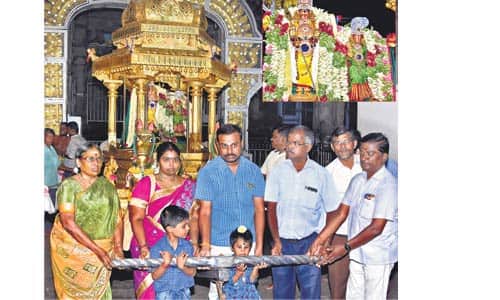 ஏராளமான பக்தர்கள் ஆண்டுக்கு ஒருநாள் தாங்கள் விரும்பிய நாளில் தங்கரதம் இழுக்க 25 ஆயிரம் ரூபாய் வைப்புத் தொகையாக செலுத்தி உள்ளனர். இந்த தங்க ரதத்தில் சேதமடைந்த பொம்மைகள் 2 நாட்களாக சீரமைக்கப்பட்டது.