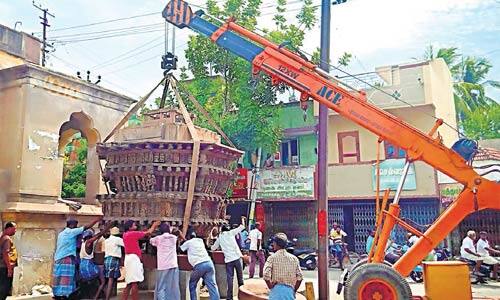இந்து அறநிலையத்துறை சார்பில் ரூ.10 லட்சம் நிதி ஒதுக்கப்பட்டு பணிகள் துவங்கியது. பின் 6 மாதத்தில் பணி கிடப்பில் போடப்பட்டது.மீண்டும் கடந்த 2 ஆண்டுகளுக்கு பின், திருச்சி பெல் நிறுவனத்தில் தேருக்காக நான்கு சக்கரங்கள் ரூ. 2 லட்சம் மதிப்பீட்டில் கொள்முதல் செய்யப்பட்டு அப்படியே கிடந்தது.இந்நிலையில், நேற்று (ஜூன்., 30ல்) அறநிலையத்துறை சார்பில் தேருக்கு சக்கரம் பொருத்தும் பணி கிரேன் மூலம் நேற்று (ஜூன்., 30ல்) நடந்தது.