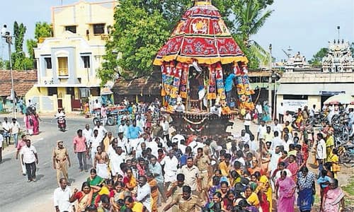 புதுக்கோட்டை, திருக்கோகர்ணம், பிரகதாம்பாள் கோவிலில் வீற்றிருக்கும் பிரகதாம்பாள் அம்மன், புதுக்கோட்டை சமஸ்தானத்தை ஆட்சி செய்த, தொண்டைமான் மன்னர்களின் குலதெய்வம்.இக்கோவிலில், ஆண்டுதோறும், ஆடிப்பூரத் திருவிழா விமரிசையாக நடப்பது வழக்கம். இந்த ஆண்டு, 25ம் தேதி, கொடியேற்றத்துடன், விழா துவங்கியது. நேற்று, தேரோட்டம் நடைபெற்றது. காலை, சிவாய நமஹ என்ற பக்தர்களின் பக்தி கோஷத்துடன், அலங்கரிக்கப்பட்ட தேரில், கோகர்ணேஸ்வரர், பிரகதாம்பாள் எழுந்தருளினர்.சிவனடியார்கள், திருமுறை பாடல்களை பாட, தேரின் வடக்கயிற்றை, பக்தர்கள் இழுத்தனர். சிறிது நேரத்தில், வடக்கயிறு, திடீரென அறுந்தது. இதையடுத்து, பக்தர்கள், சேலை மற்றும் கயிறு ஆகியவற்றால், வடகயிற்றை இணைத்தனர். அதன் பின், தேரோட்டம் தொடர்ந்தது. நான்கு வீதி வழியாக வலம் வந்து, கோவிலுக்கு அருகே, தேர் நிலைக்கு வந்தது.