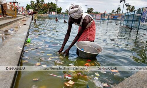 காரைக்கால்: திருநள்ளார் சனீஸ்வர பகவான் கோவிலில் நளன் குளத்தில் பக்தர்கள் விட்டு செல்லும் பொருட்களை கோவில் நிர்வாகம் ஊழியர்கள் மூலம் அகற்றும் பணியில் ஈடுபடுகின்றனர்.