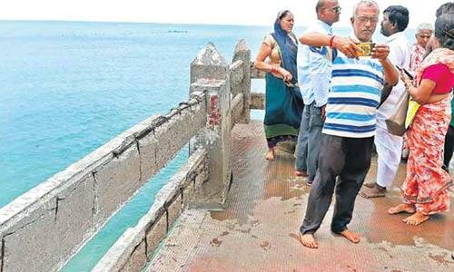 ராமேஸ்வரம்: ராமேஸ்வரம் அருகே கடலில் ராமர் உருவாக்கிய வில்லுண்டி தீர்த்த கிணறு தடுப்பு சுவர் சேதமடைந்துள்ளதால் பக்தர்கள் பீதியில் செல்கின்றனர்.ராமாயணத்தில், ’இலங்கையில் இருந்து சீதையை மீட்ட ராமர் ராமேஸ்வரம் வந்த போது, சீதைக்கு தாகம் எடுத்தது. உடனே ராமபிரான், வில்லில் அம்பு எய்து கடலில் துளைத்ததும் நல்ல நீர் பீறிட்டு வந்தது. இதனை சீதை உள்ளிட்ட அனைவரும் பருகி தாகம் தணித்தனர்’ என கூறப்படுகிறது. ராமர் வில் அம்பில் உருவாக்கிய இத்தீர்த்தத்திற்கு ’வில்லுண்டி தீர்த்தம்’ என பெயரிட்டனர்.