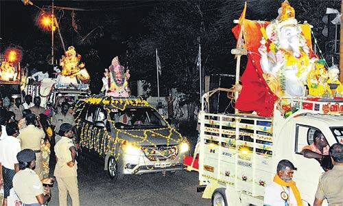 சுகந்தம் ஆயில் மில் நிறுவனர் ராமகிருஷ்ணன் தலைமை வகித்தார். மாநில நிர்வாக குழு உறுப்பினர் மாயகூத்தன் ,ஆர்.எஸ்.எஸ், பா.ஜ., வி.எச்.பி., உள்ளிட்ட அமைப்புகளின் பொறுப் பாளர்கள் பேசினர். பஞ்சு மார்க்கெட்டில் ஆரம்பித்து காந்தி சிலை ரவுண்டானா, அம்பலப்புளி பஜார் வழியாக புது பஸ் ஸ்டாண்டு அடுத்த கருங்குளம் கண்மாய் வந்தது. அங்கு சிலைகள் கரைக்கப்பட்டது.ஊர்வலத்தை முன்னிட்டு ராஜபாளையம் டி.எஸ்.பி., ரவிச்சந்திரன் தலைமை யில் போலீசார் பாதுகாப்பு பணியில் ஈடுபட்டனர்.