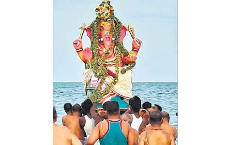 ராமேஸ்வரம்:செப்.,2ல் விநாயகர் சதுர்த்தி விழா முடிந்ததும் பிரதிஷ்டை செய்த விநாயகர் சிலைகளை கடல், குளம், ஆறுகளில் இந்து முன்னணி, இந்து மக்கள் கட்சி, விழாக் குழுவினர் கரைத்து வருகின்றனர்.அதன்படி மதுரை கீழவாசலில் உள்ள அரசமரம் விநாயகர் கோயிலில் சுற்றுசூழலுக்கு பாதிப்பு இல்லாத களிமண்ணில் உருவாக்கிய ஐந்தரை அடி உயர விநாயகர் சிலையை, விழா குழுவினர் லாரியில் ஏற்றி நேற்று (செப்., 6ல்) மாலை ராமேஸ்வரம் திருக் கோயில் அக்னி தீர்த்த கரைக்கு வந்தனர்.